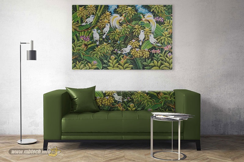 Pertama, bagi yang memiliki interior bernuansa etnik Papua bisa menggunakan lukisan Cenderawasih sebagai pemanis ruangan. Lalu agar makin serasi, sofa dalam ruangan tersebut bisa dilapisi bahan berwarna senada dengan lukisan, seperti warna Natural (MB 6008) dan Caramel (MB 6022). Selain itu juga bisa disematkan bordir aksen yang ada di lukisan pada sandaran sofa agar lebih menawan.