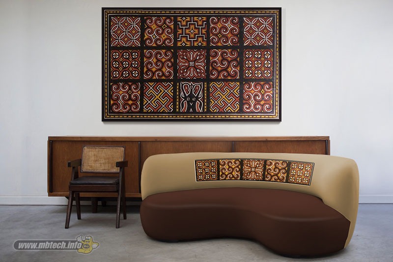 Anda juga bisa menyerasikan lukisan khas Toraja dengan warna sofa yang dibalut warna Natural dan Texas (MB 6021). Agar semakin menarik, sematkan bordir khas kain Toraja pada sofa tersebut. ‘Jadi unik deh sofa nya…’