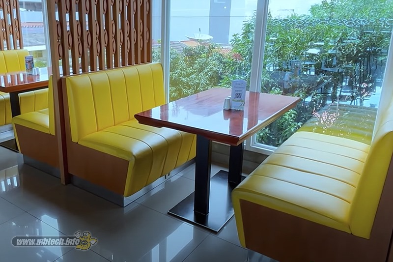 Seperti yang Mister MB lihat di area Biz Lounge ada pemakaian bahan MBtech pada sofa dengan kombinasi warna MBtech Giorgio Black (MB 6001) dan MBtech Picasso Beige (MB 5005). Kemudian ada juga sofa island bermotif kotak-kotak bernuansa kasual di lobi memakai warna Tropicana (MB 7007) dan Gogo Blue (MB 7010) dari MBtech Camaro Fiesta.