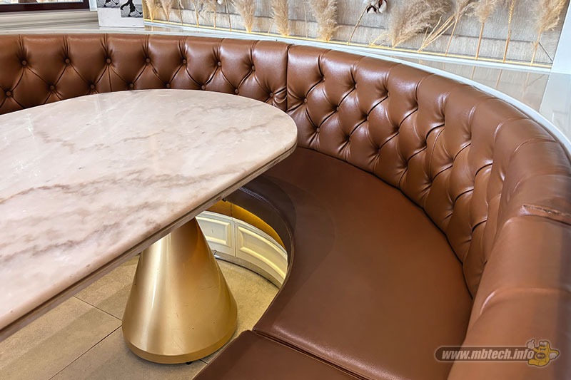 Area ruang makan berdesain ‘U Shape’ itu diberikan sentuhan nuansa Eropa klasik yang estetik. Maka sandaran sofa memakai motif Chesterfield dengan aksen kancing tanam yang ikonik. Sedangkan dudukan sofa dibiarkan polos, semua bagian sofa dilapis bahan MBtech Camaro-Saddle (MB 9012).