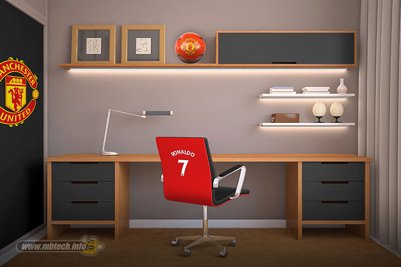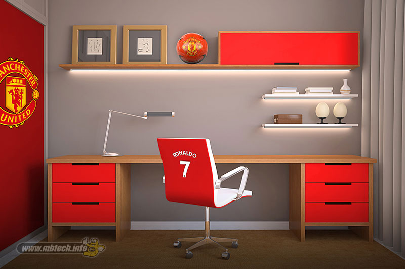 Inspirasi pertama, Mister MB membuatkan ruangan berwarna identik Manchester United. Anda bisa menggunakan warna merah untuk mewarnai dinding dan beberapa bagian furnitur. Tak lupa berikan berupa logo MU pada dinding agar semakin kental nuansanya.