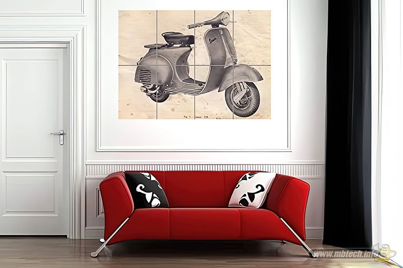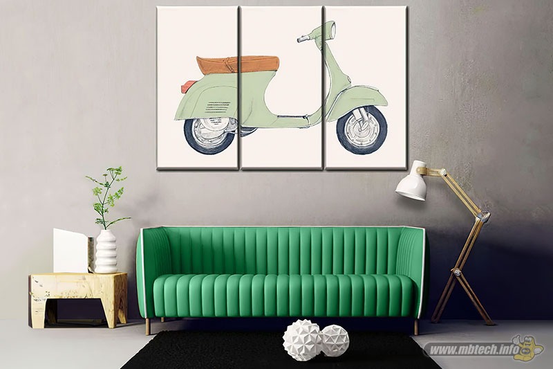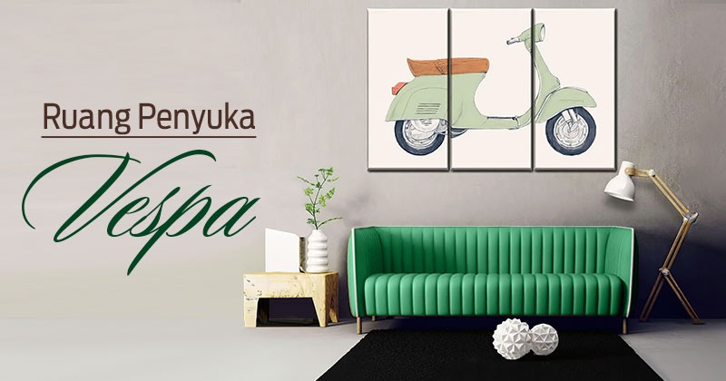 Berikan dekorasi lukisan atau gambar pada dinding dengan tema Vespa sudah bisa membuat ruang terlihat lebih personal. Makin lengkap jika ruang tersebut diberikan sofa untuk duduk santai menikmati waktu luang di rumah.