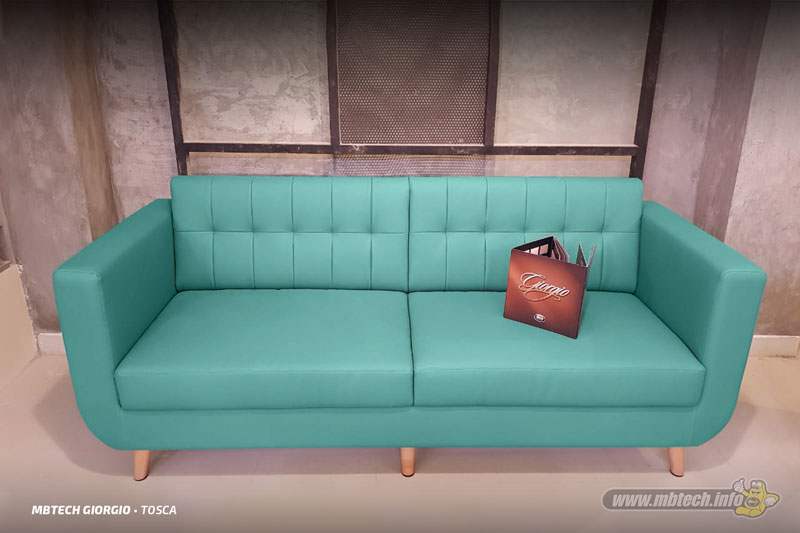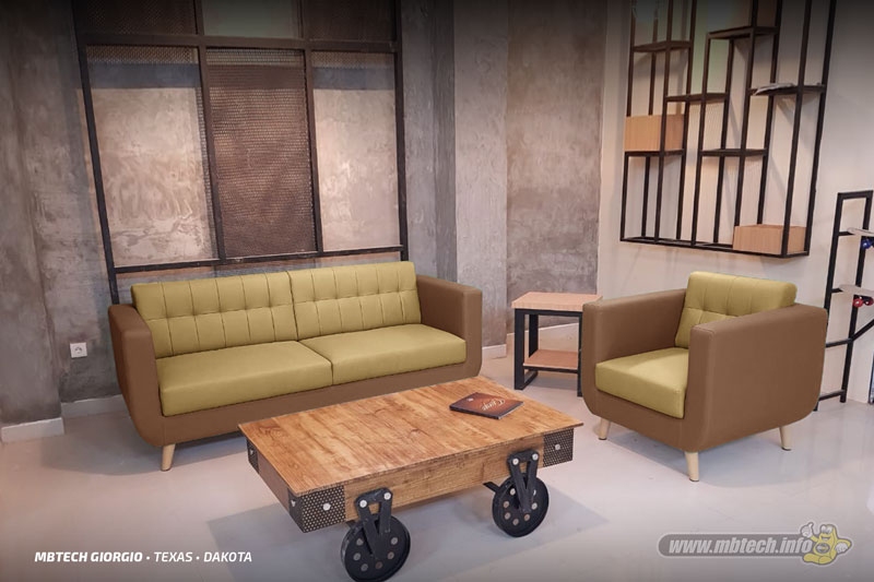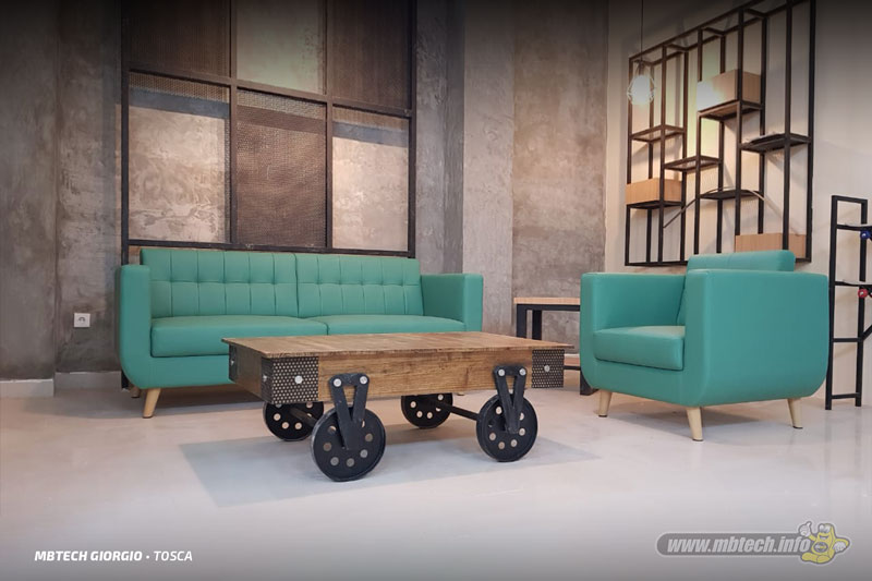 Sofa dengan model modern minimalis tersebut menggunakan bahan MBtech Giorgio warna Tosca (MB 6040). Warnanya asyik untuk nuansa interior barbershop yang industrial.