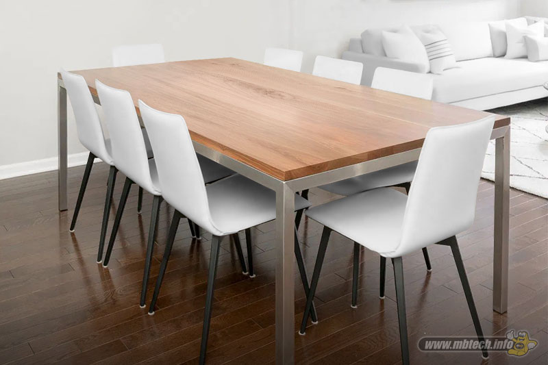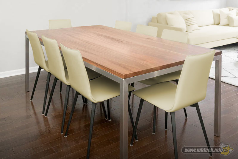 Anda bisa menggunakan meja kayu yang dapat menampung 4 sampai 6 orang. Gunakan juga kursi yang bermaterial dasar kayu dengan dudukan busa yang dibalut bahan MBtech Premium – Carrera warna Black (MBPC 1001).