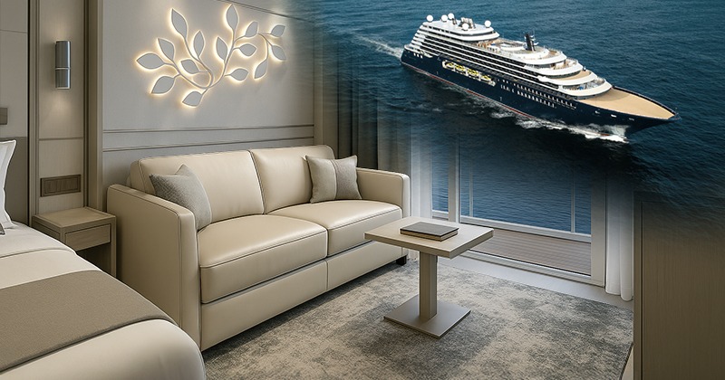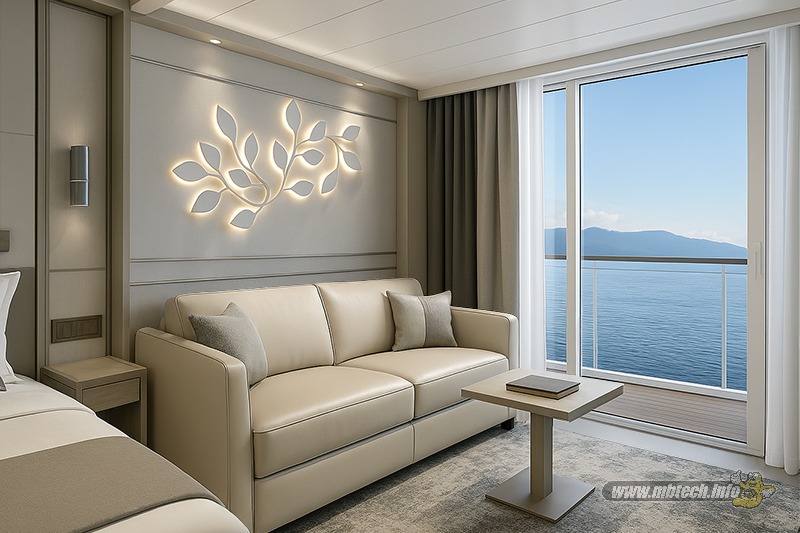 Inspirasi ketiga berbicara tentang sofa 2-seater di kabin penumpang kapal pesiar. Interior berdesain elegan modern minimalis itu tampil artistik bergaya minimalis, walau demikian aura kemewahannya tetap terpancar berkat hadirnya pelapis sofa MBtech Premium-Carrera berwarna Champignon (MBPC 1007).