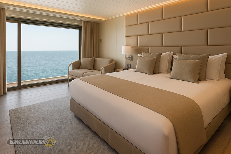 Mengakhiri gaya dekorasi interior kabin penumpang kapal pesiar, Mister MB tidak hanya meletakkan sofa klasik 2-seater di sudut ruang, inspirasi padded wall beserta rangka ranjang pun ikut dilapis MBtech Camaro warna Mocca (MB 9011). Desainnya simpel namun lewat pemilihan warna yang tepat bikin kabin terasa hangat.