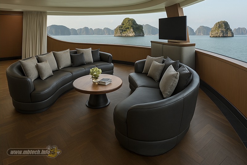Lanjut ke inspirasi kedua yang masih berkutat di area buritan kapal pesiar, bedanya inspirasi ini berada di dalam kabin dengan jendela terbuka. Sofa kembar model kurva yang digunakan diwarnai Charcoal (MBPC 1002) dari MBtech Premium-Carrera. Area bersantai ini cocok dipakai untuk Anda yang ingin bersantai tanpa harus takut terkena sinar matahari.