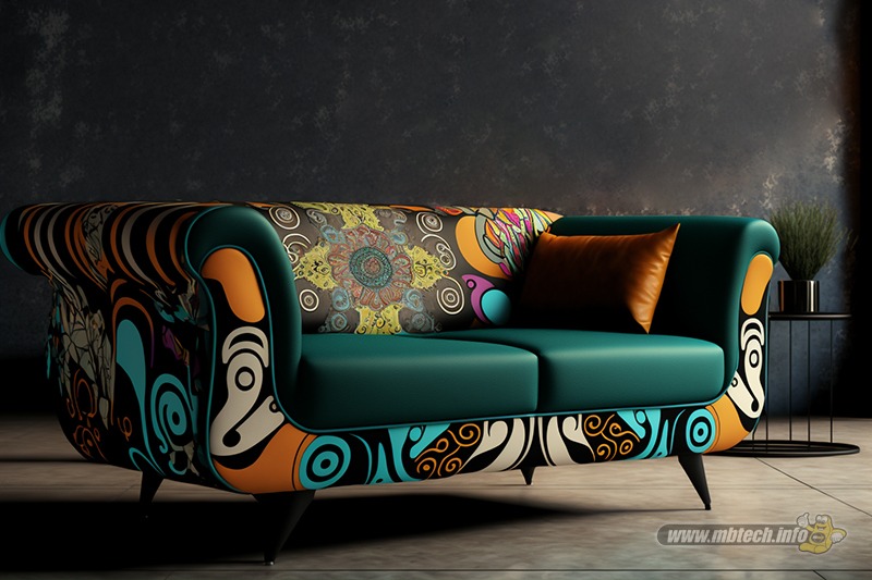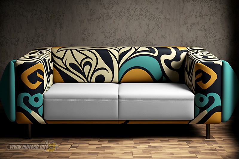 Begitu juga untuk desain inspirasi kedua yang hampir seluruh bagian sofa dilapisi bahan MBtech yang sudah dicetak motif gambar seni pilihan. Lalu dudukan dibiarkan tetap polos berwarna White.