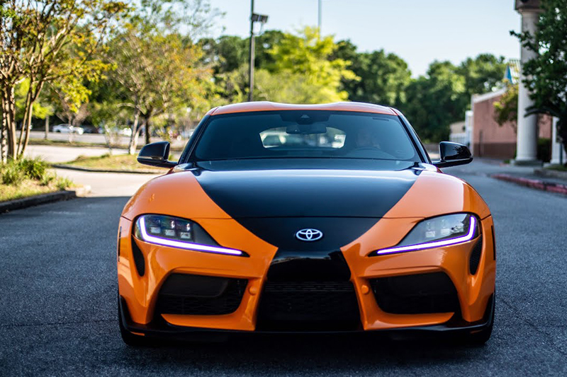 Toyota Supra yang tampil dalam Fast & Furious 9 itu dilapisi kelir oranye dengan variasi hitam di tengah kapnya. Warna ini sudah tidak asing, karena di film Fast & Furious Tokyo Drift, Han juga menggunakan warna tersebut untuk mobil Mazda RX-7.