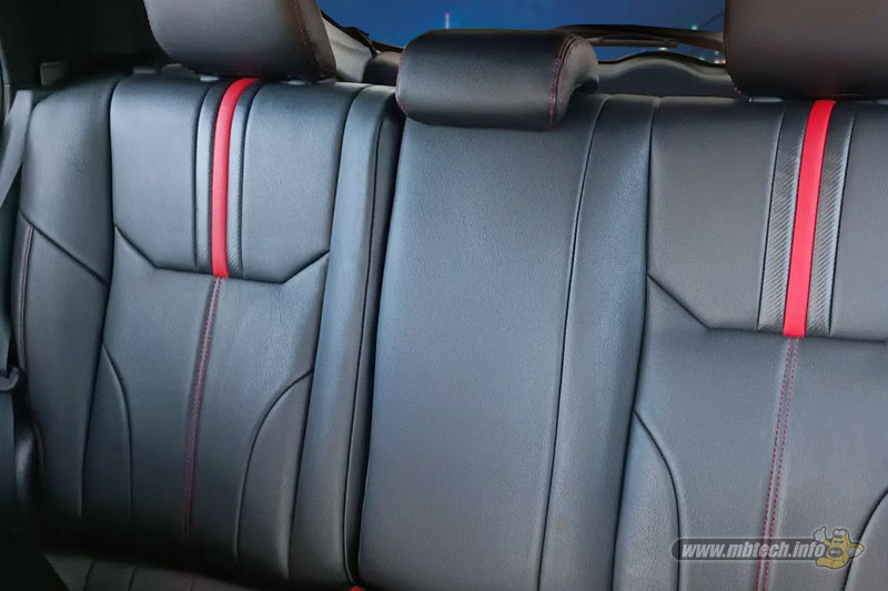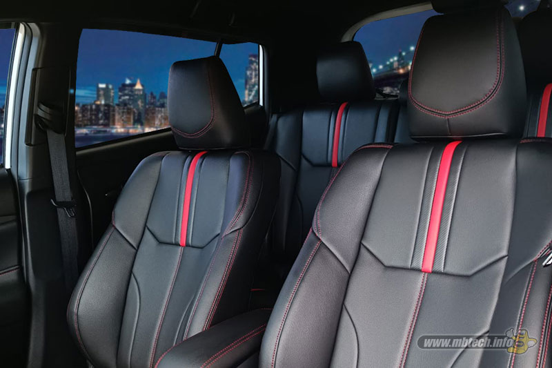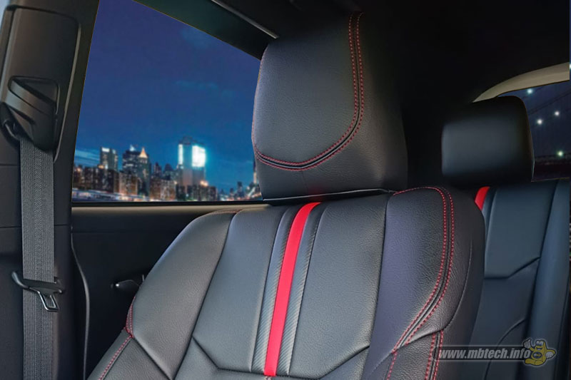 Jok, konsol boks dan doortrim dominan memakai tekstur elegan khas MBtech New Superior dengan warna Black (MB 8801). Lalu kesan sporty ditonjolkan dari detail garis Red (MB 8810) yang membelah ujung permukaan dudukan dan sandaran jok.