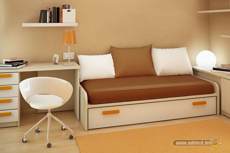 Anda bisa memanfaatkan sudut ruang kamar dengan mengisi berbagai furnitur yang dibutuhkan, seperti meja belajar, kursi dan rak dinding. Berikan juga sofa agar ada spot membaca yang lebih santai. Lapisi sofa dengan bahan berkualitas dan mudah perawatannya agar sofa selalu terjaga tampilannya.