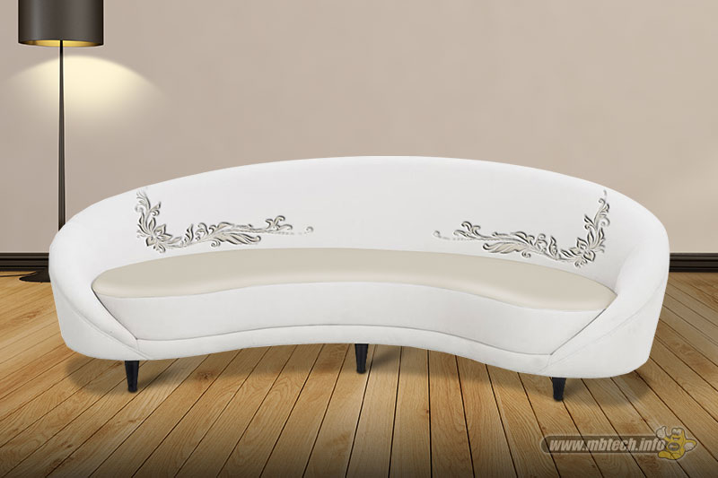 Selanjutnya ada bentuk sofa yang lebih stylish dengan perpaduan dua warna Black (MBPC 1001) dengan White (MBPC 1004) dari MBtech Premium - Carrera. Lalu pada bagian sandaran sofa diberikan motif ornamen yang dibordir dengan benang warna hitam.