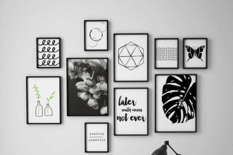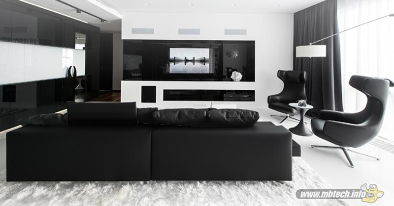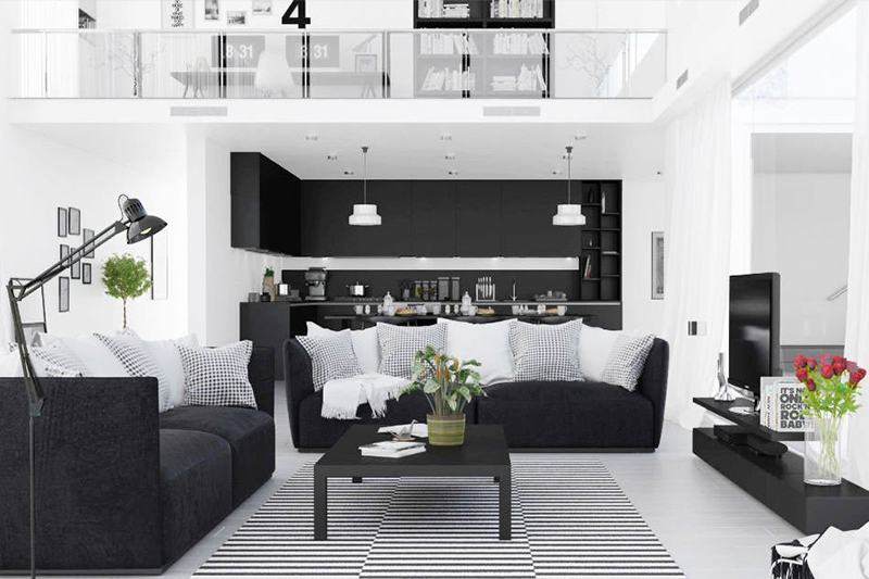Penerapan warna putih akan membuat ruangan nampak lebih luas dan bersih, sedangkan sentuhan warna hitam atau abu-abu akan memberikan nuansa kenyamanan. Perpaduan warna tersebut bisa diterapkan pada warna dinding, aksesoris, furnitur atau hiasan yang menggantung di tembok.