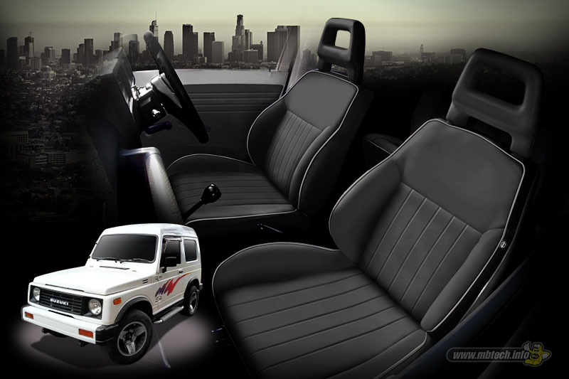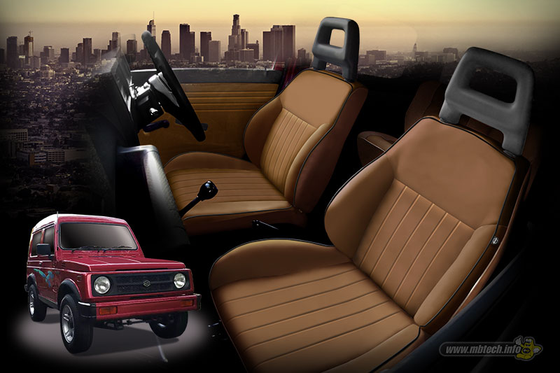 Inspirasi jok ikonik yang melegenda di car classic enthusiast yakni motif garis-garis vertikal dijadikan ide memperindah jok mobil Katana. Warna klasik bernuansa elegan, Saddle (MB 9012) menjadi warna dominan di interior. Tidak ketinggalan aksen khas yaitu lis atau piping pada tepian sayap jok dibalut warna Cream (MB 9007). Kedua warna itu diambilkan dari varian MBtech Camaro.
