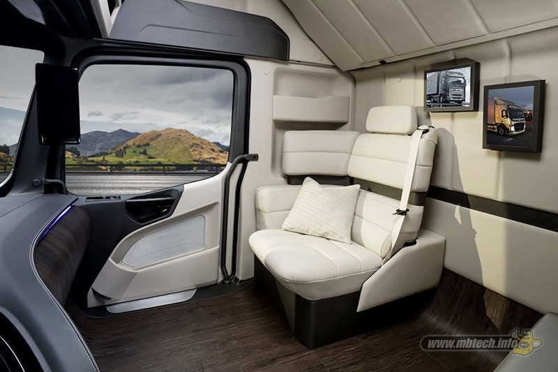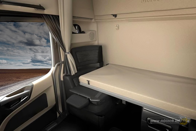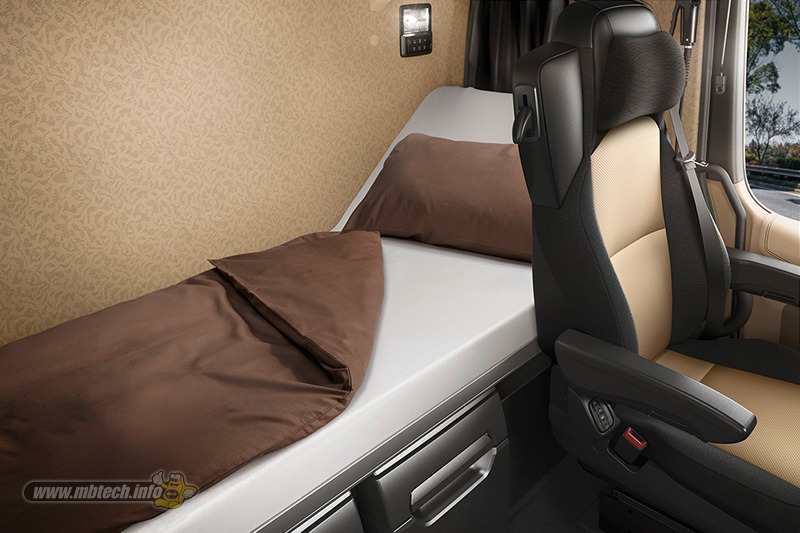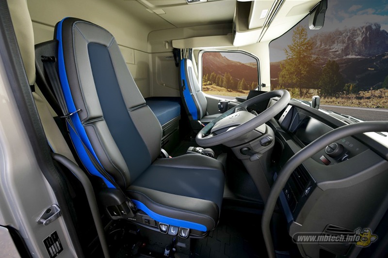 Ada truk yang dibekali dengan jok yang memiliki tampilan aero dinamis dengan perpaduan warna yang keren. Jok dibalut dengan warna yang juga tersedia di bahan MBtech, seperti warna Denim (MB 6031), Fossil (MB 6004) dan Sapphire (MB 6033) dari MBtech Giorgio. Pada area belakang jok terdapat juga tempat istirahat untuk pengemudi yang dibalut dengan bahan sintetik warna Navy (MB 6032).