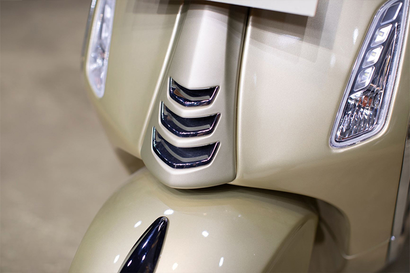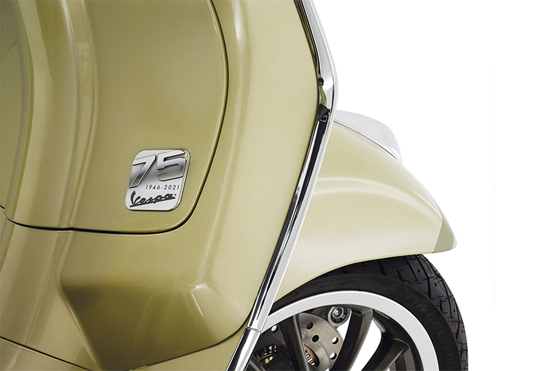 Vespa edisi terbatas ini, hadir dengan warna kuning metalik “Giallo 75th” yang dibuat khusus oleh Vespa. Kemudian di bagian bodi samping dan sepatbor depan Vespa edisi terbatas ini, terdapat angka 75 dengan warna sedikit lebih dominan dengan menciptakan efek tone-on-tone yang elegan.