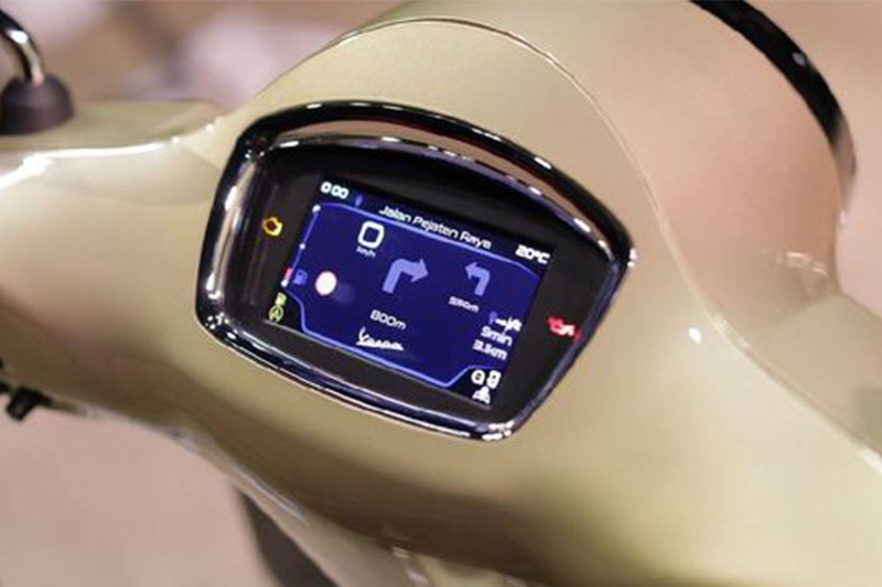Selain itu, motor juga dapat terhubung dengan ponsel melalui sistem konektivitas Vespa MIA dan aplikasi Vespa App. Hal ini memungkinkan pengendara untuk terhubung melalui Bluetooth dari smartphone iOS atau Android ke fitur elektronik on board Vespa. Pengendara dapat mengakses informasi di ponsel melalui monitor pada panel instrumen tersebut.