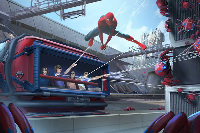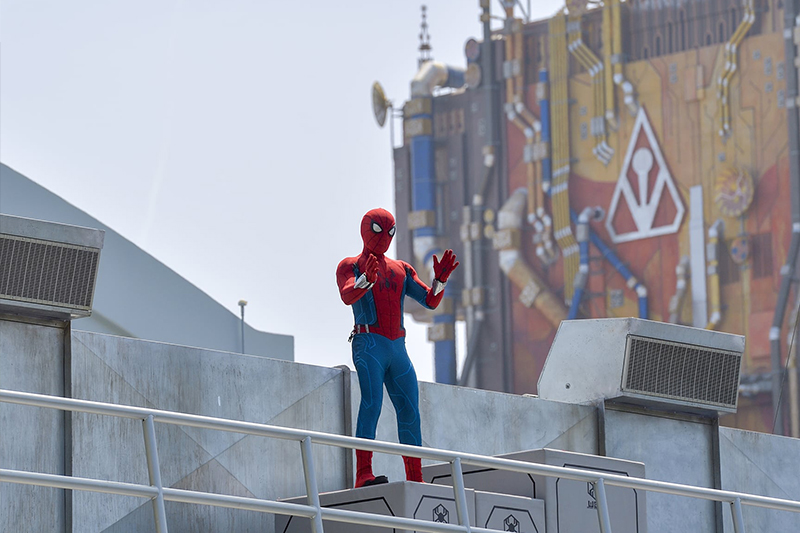 Saat memasuki area, pengunjung langsung disambut oleh atraksi robot Spider-Man yang melakukan jungkir balik dan terbang di ketinggian 60 kaki atau 18,3 meter di udara. Setelah penampilan itu selesai, barulah Spider-Man yang diperankan manusia datang menyambut para pengunjung.