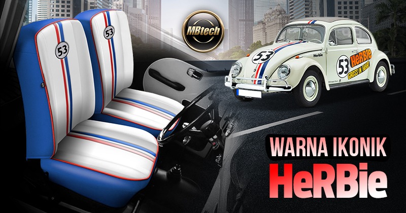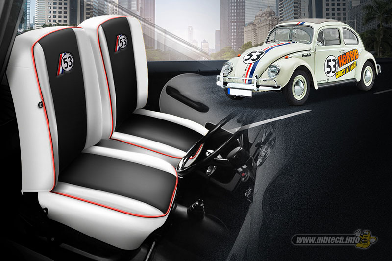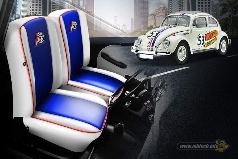 Inspirasi pertama, jok dilapisi bahan MBtech Giorgio. Warna yang dipilih merupakan warna ikonik Herbie yakni warna Alaska (MB 6006) sebagai warna alas dudukan dan sandaran jok. Lalu untuk bagian samping hingga punggung jok menggunakan warna Sapphire (MB 6033) dengan diberi piping warna Scarlet (MB 6027). Tak lupa diberi nomor ‘53’ pada sandaran dan garis ganda vertikal dengan warna Scarlet dan Sapphire.