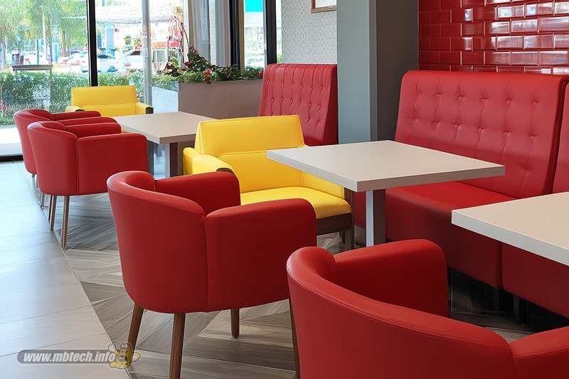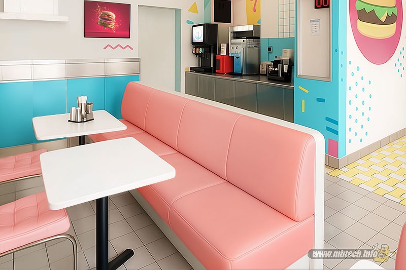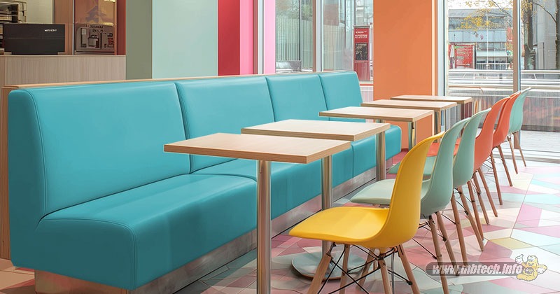 Contohnya resto cepat saji yang punya interior berdekorasi warna pastel. Untuk mengisi area tempat duduk maka diberikan sofa deret yang berpasangan dengan meja plus kursi warna-warni. Makin aktraktif diwarnailah sofa memakai pelapis berkelir Cyan Blue (MB 7009) dari MBtech Camaro Fiesta.