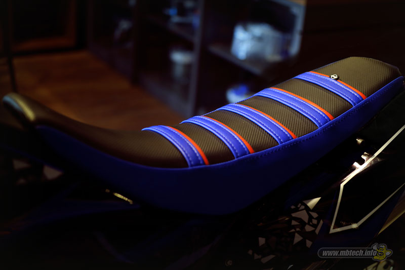 Untuk WR155 Supermoto berwarna bodi hitam dipilih kombinasi warna jok yang serasi dengan decalnya. Rey menaruh aksen Blue (MB 8814) untuk area samping dan garis di atas dudukan memakai varian MBtech New Superior.